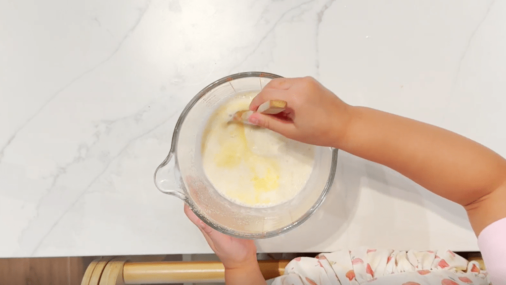 👧 Kid Task: Help stir the butter and sugar into the milk and watch the yeast bubble!