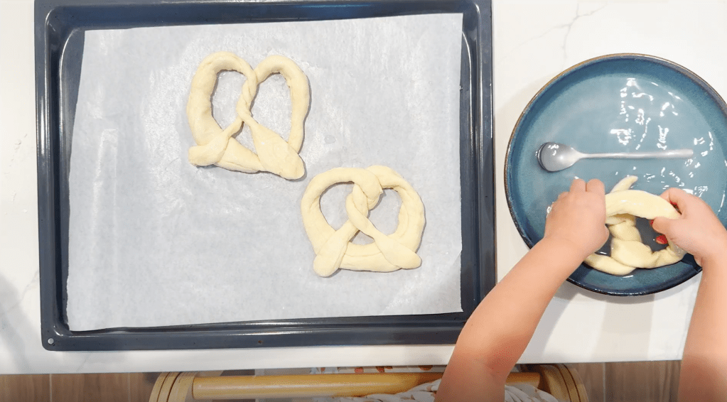 Punch down the dough and divide into 10 pieces. Roll each into a long rope (about 36 inches), then twist into a pretzel shape.