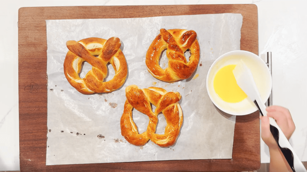 Brush warm pretzels with melted butter and sprinkle with coarse salt (or cinnamon sugar for a sweet twist).