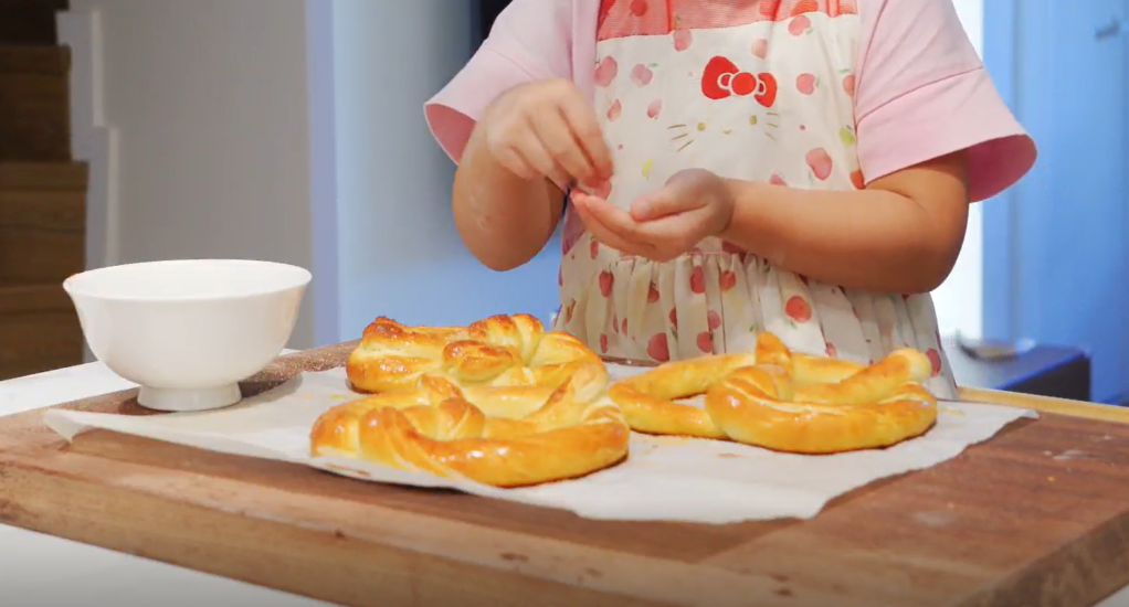 - Divide dough into 10 pieces. Roll into ropes and twist into pretzel shapes.